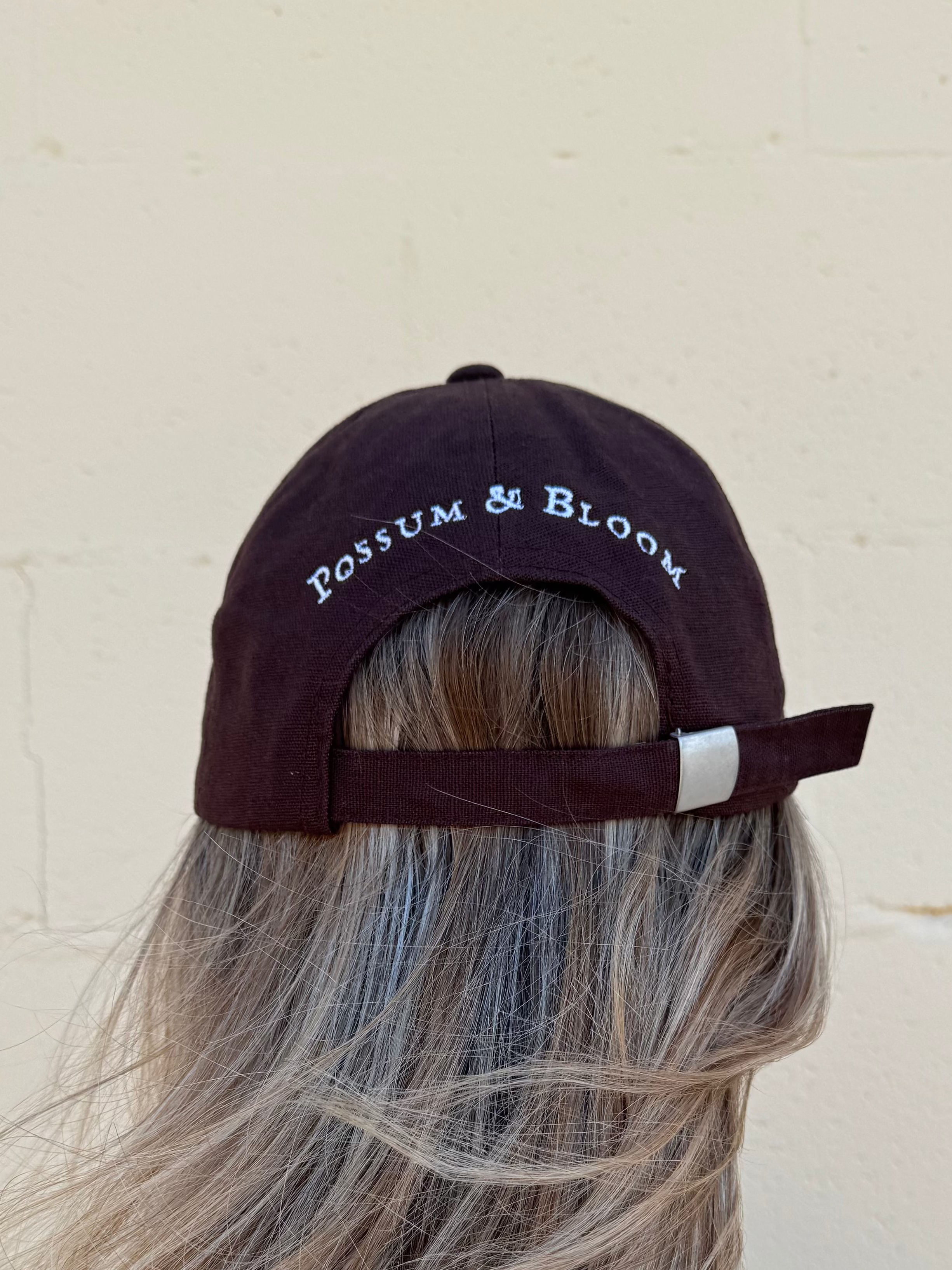 A natural linen cap finished with a soft bow at the front and Possum & Bloom embroidered on the back. Effortlessly pretty and easy to wear.